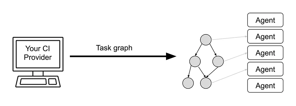 A traditional CI execution is a directed acyclic graph (DAG) of virtual machines (VMs). Each VM (often called a job) installs dependencies, restores NPM cache, and then runs the necessary steps to verify that, say, some tests pass.