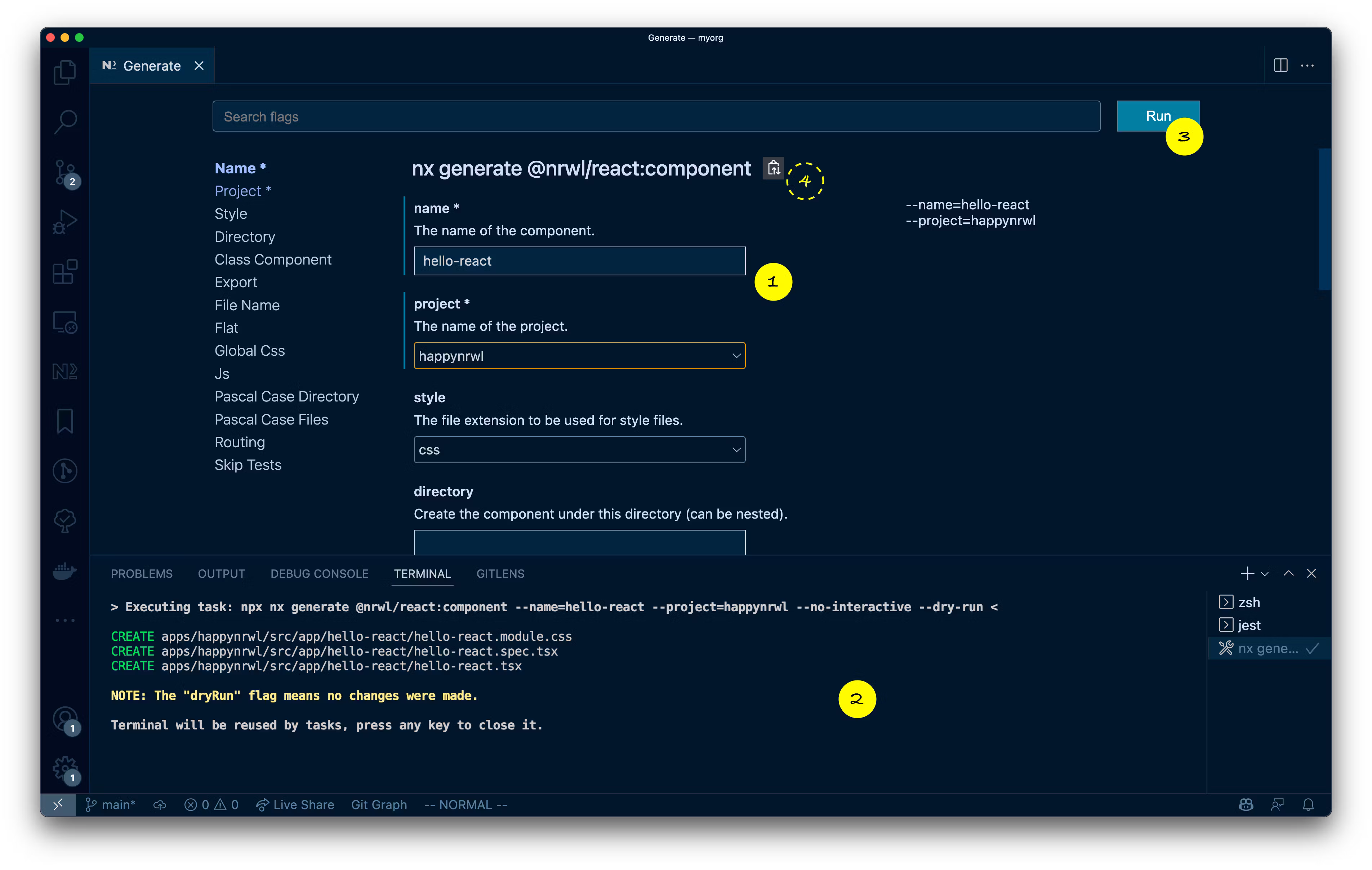 Actions to generate a new React component with Nx Console
