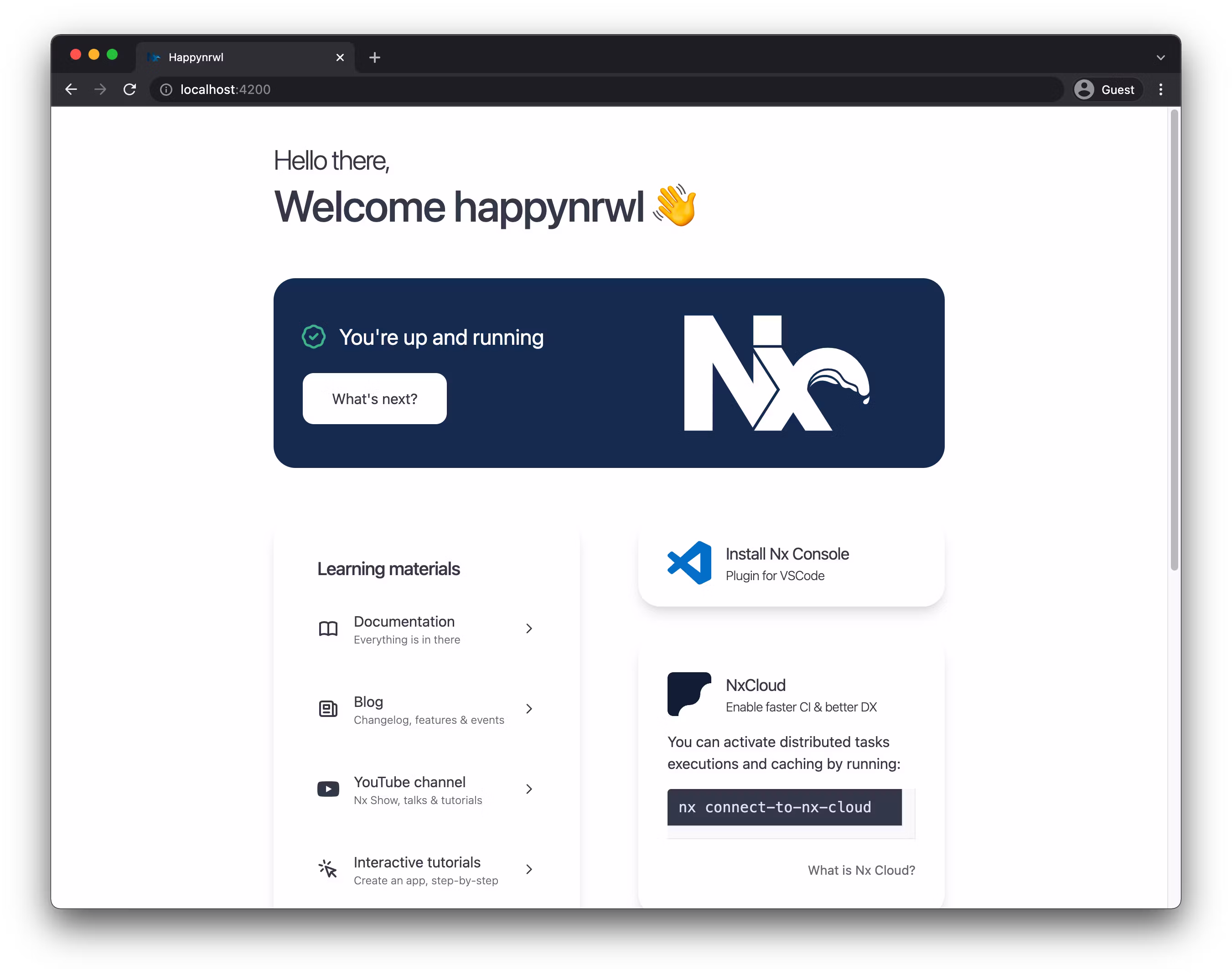 Going to http://localhost:4200 should show the running React app located in apps/happynrwl.