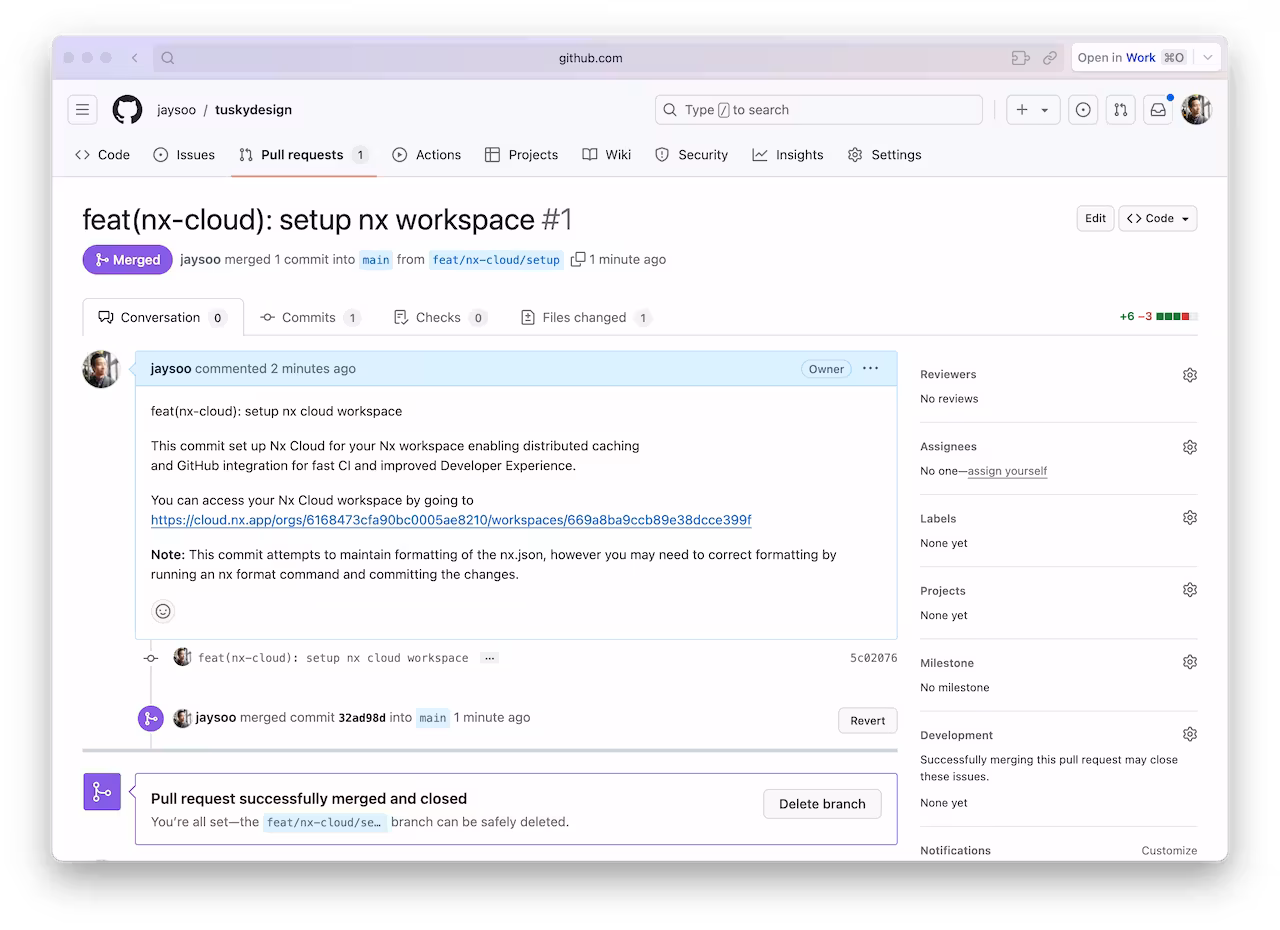 When you view the PR on GitHub, you will see a comment from Nx Cloud that reports on the status of the CI run.